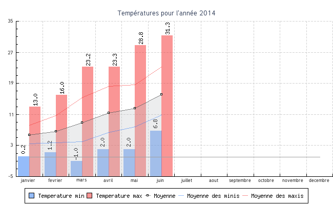 | juin | 6.8 °C | 10.5 °C | 31.3 °C | 23.9 °C | 16.4 °C | 1.0 km/h | 15.5 km/h | E |