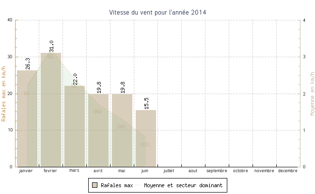 | fevrier | 1.2 °C | 3.7 °C | 16.0 °C | 10.7 °C | 6.6 °C | 3.2 km/h | 31.0 km/h | SO |