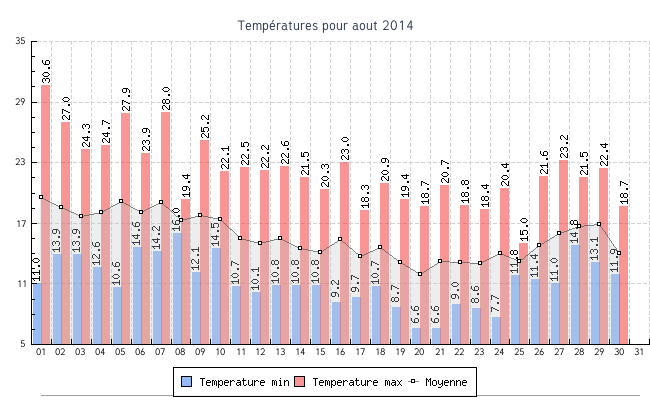 | 30 | 11.9 °C | 18.7 °C | 14.0 °C | 0.5 km/h (6.5 km/h) | SO |