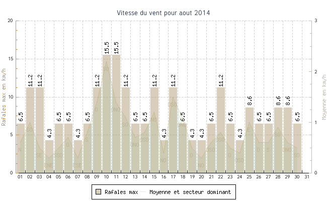| min | max | moy | Vitesse (rafales) | Secteur | ||